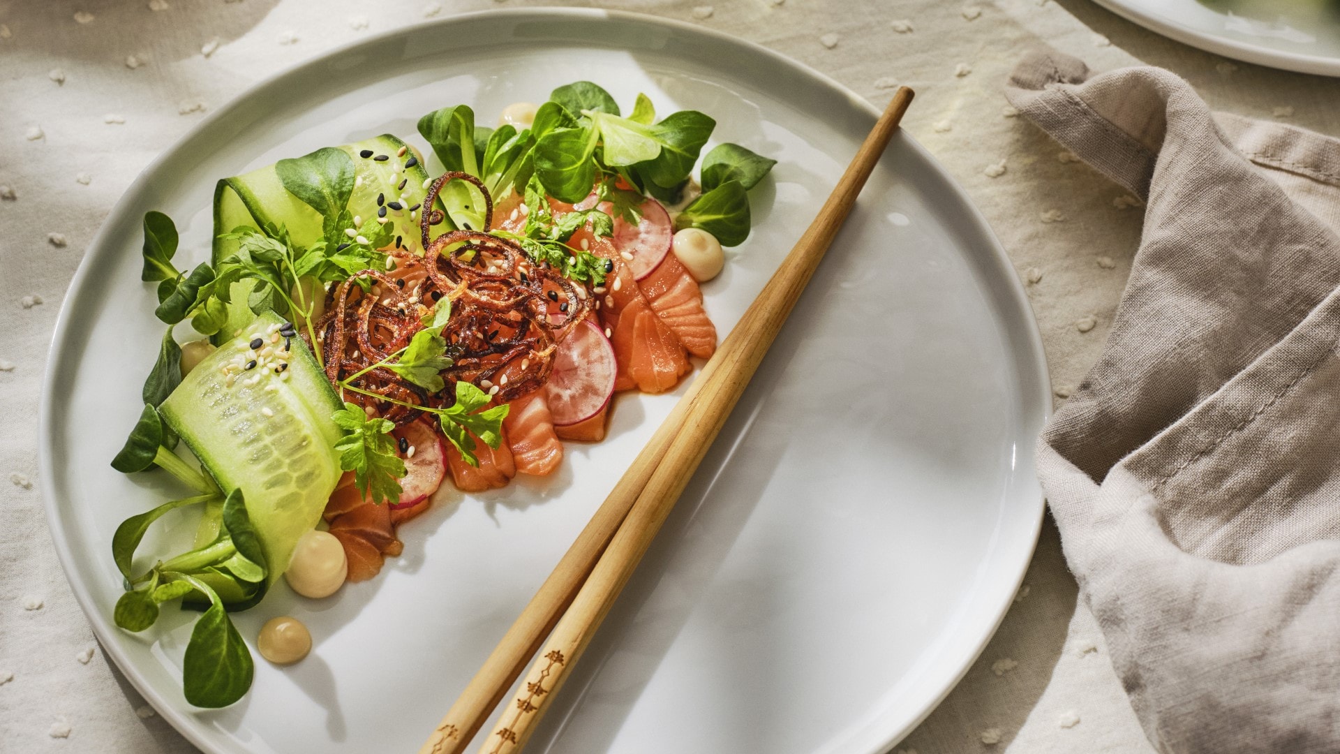 10. Montera machesallad, lax, gurka, rädisor fint på tallrik