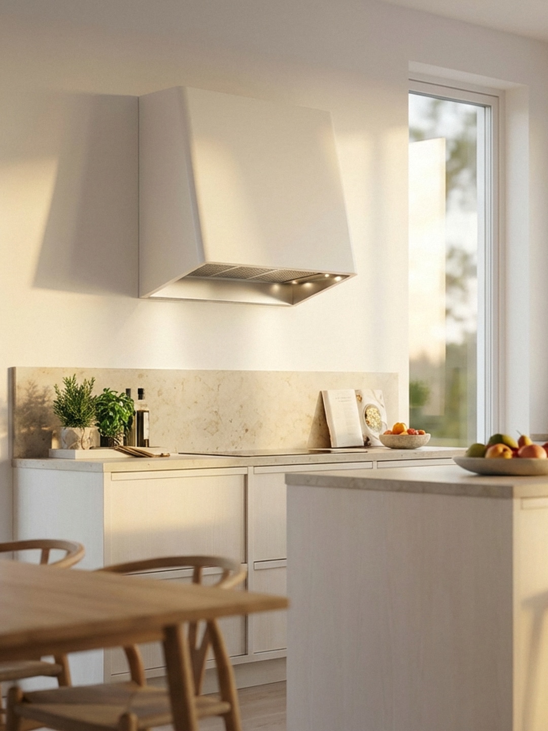 Myrholm minimerar oset med en rejäl uppfångningsyta, perfekt för att hålla köket fräscht även vid intensiv matlagning. Fläkten har fått en mjukare, mer organisk design där radiebockningar à 40 mm harmoniserar med fläktens format. En lutande och lite synligare undersida bidrar till det trevliga intrycket.